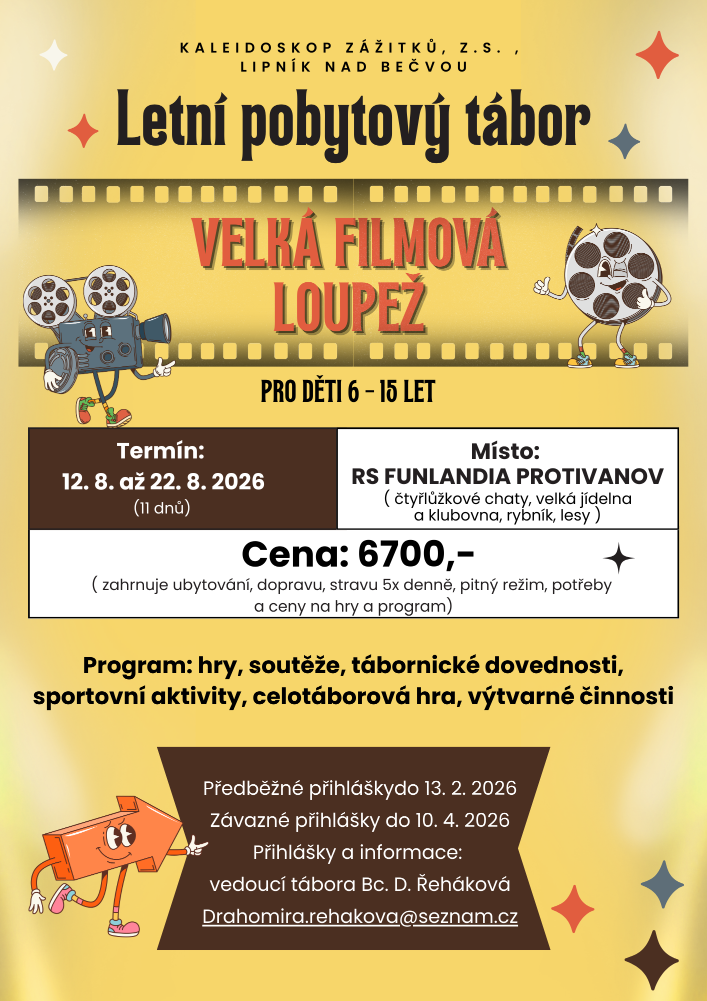 K našemu táborovému životu patří tradiční táborové dovednosti, výlety, hry soutěže a každý rok nová celotáborová hra.